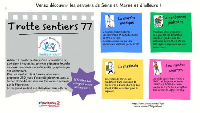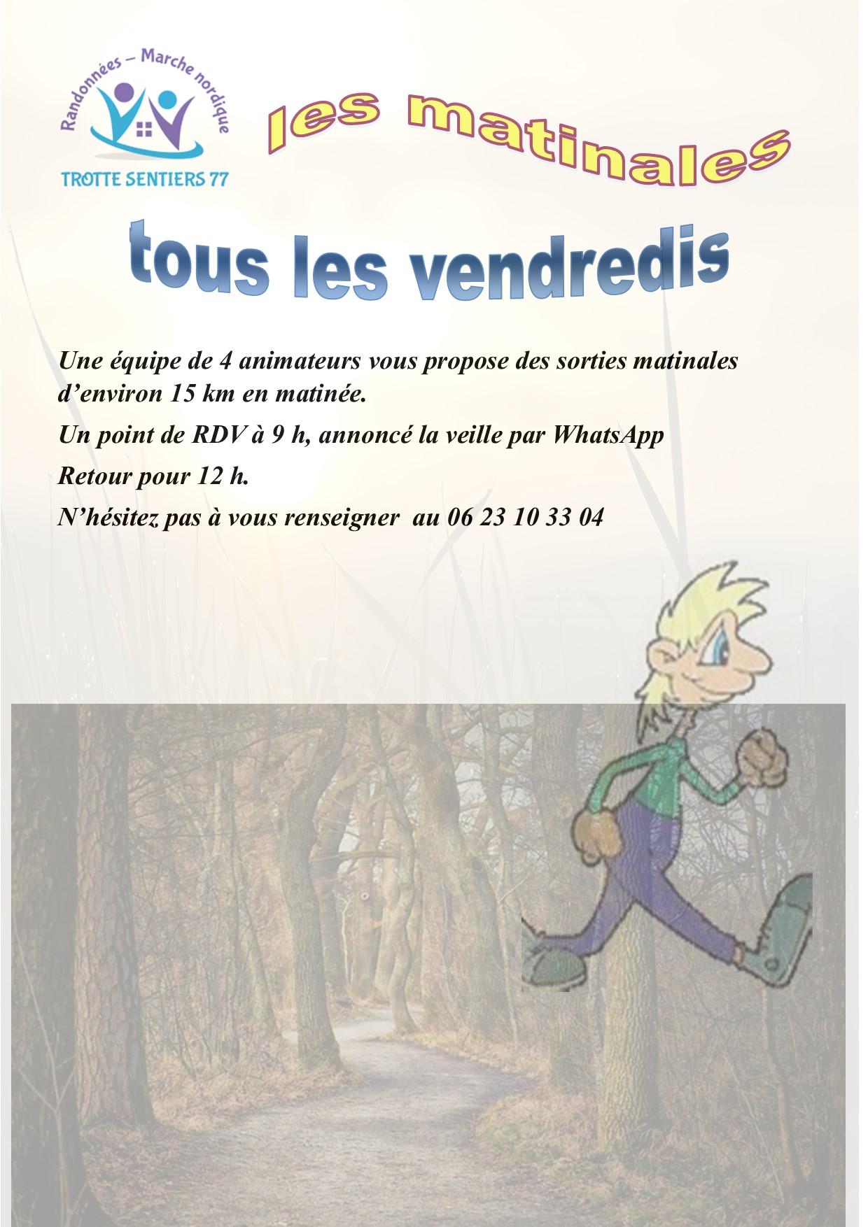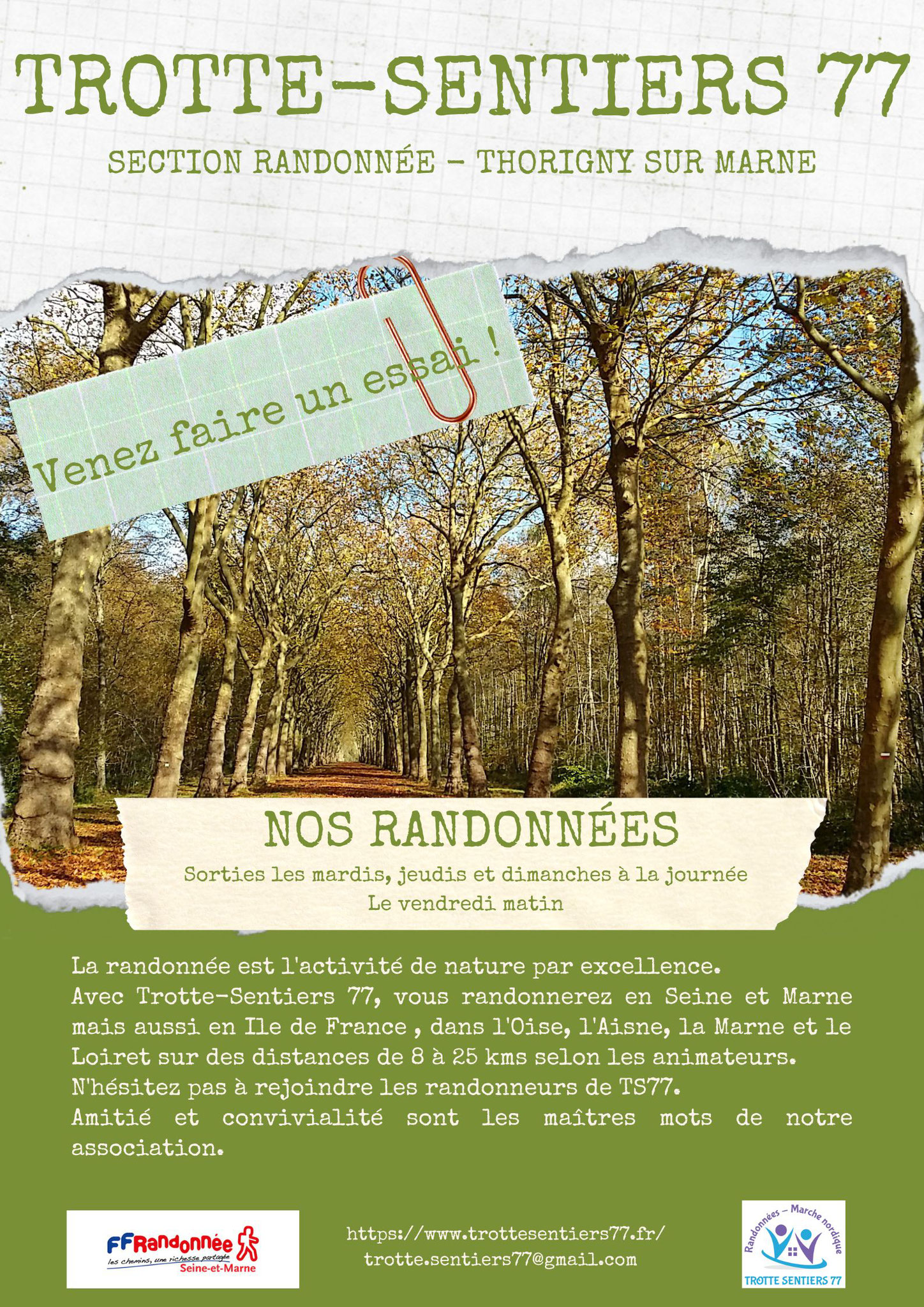 Les mardis, jeudis et dimanches de chaque mois, une randonnée à la journée est organisée sur une distance entre 15 et 25 kms. Les vendredis matin des randonnées à marche soutenue sur environ 15 km durant 3 heures maximun. Les lundis matin et jeudis en soirée des randonnées courtes entre 7 et 12 km à allure douce. |