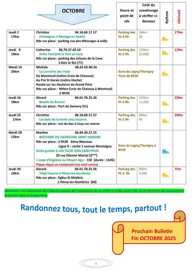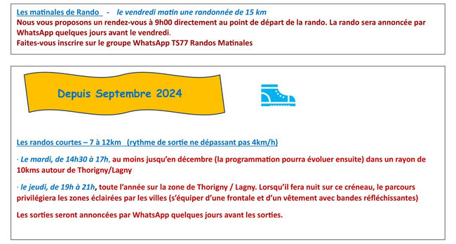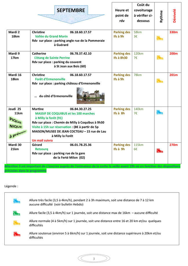REMARQUE SUR LES DISTANCES ANNONCÉES DANS LE PROGRAMME DES SORTIES :La donnée kilométrique est indicative et non contractuelle, elle peut parfois être sujette à variation en plus ou en moins selon la configuration du terrain ou les divers obstacles rencontrés obligeant l'animateur(trice) à modifier in-situ l'itinéraire prévu.Nos sorties sont également annoncées chaque semaine par e-mails et/ou par whatsapp avec d'éventuelles modifications du programme initial.